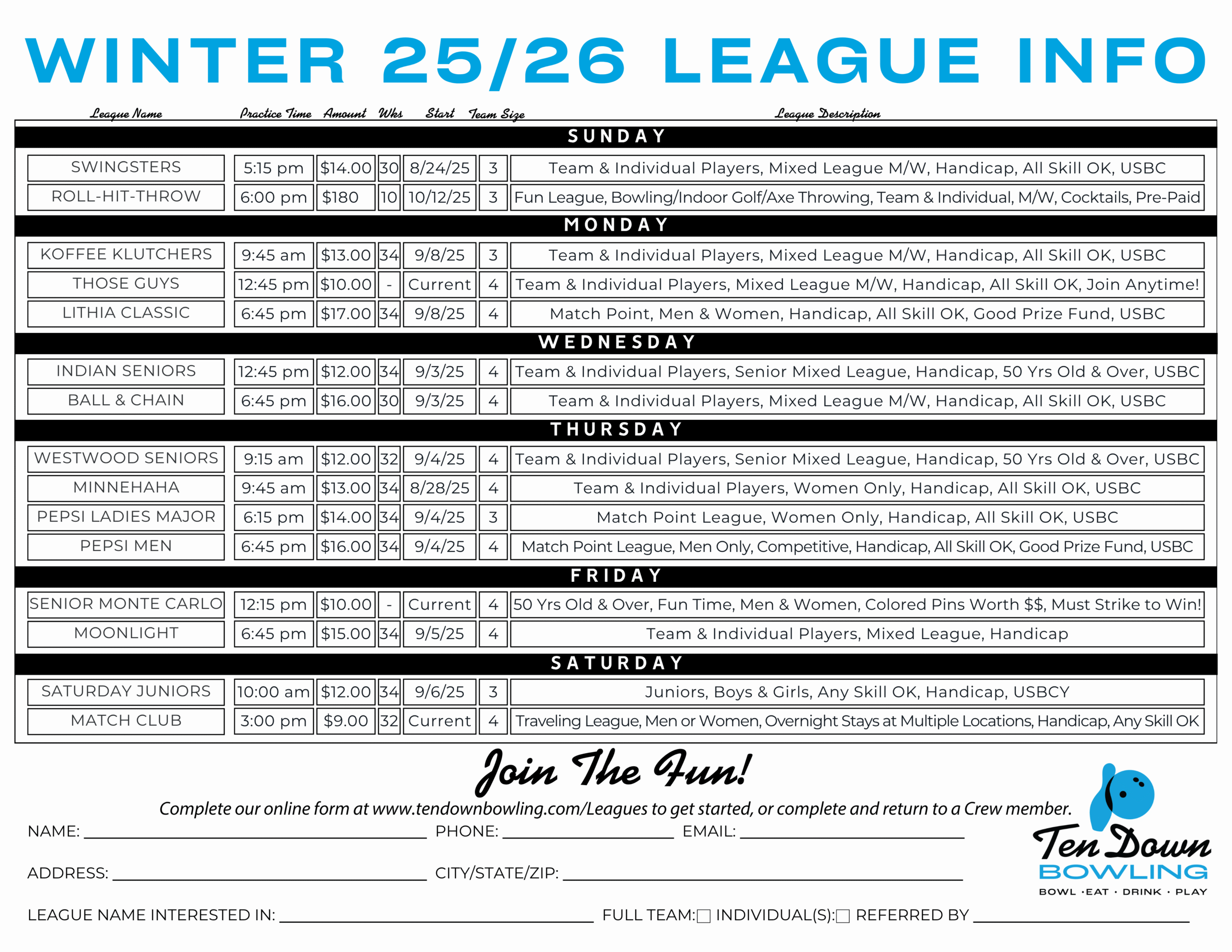 TenDown league members enjoy perks and discounts! In addition to a PassCard loaded with $$ to be used for bowling, food and arcade, League Bowlers also get a 10% discount on purchases from our Pro Shop. We do special “Shoot-Out” contests, incentive programs, and more fun stuff for TenDown League Bowlers!